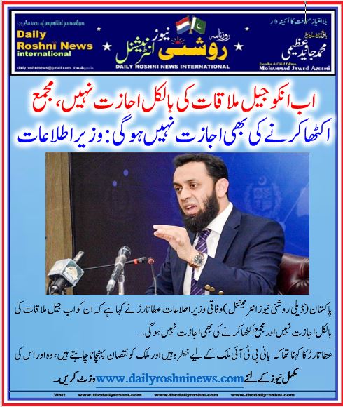 وفاقی وزیر اطلاعات عطا تارڑ نے کہا ہے کہ ان کو اب جیل ملاقات کی بالکل اجازت نہیں اور مجمع اکٹھاکرنے کی بھی اجازت نہیں ہوگی۔