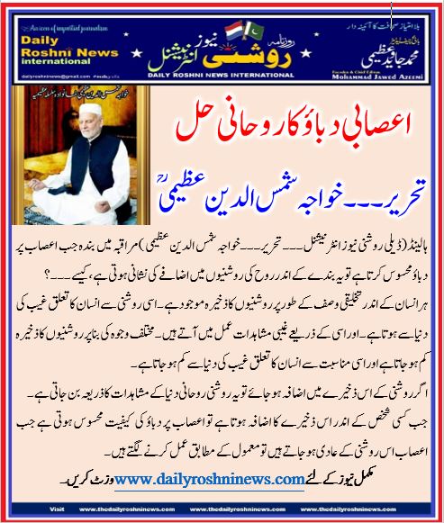 ہالینڈ(ڈیلی روشنی نیوز انٹرنیشنل۔۔۔ تحریر۔۔۔خواجہ شمس الدین عظیمی )مراقبہ میں بندہ جب اعصاب پر دباؤ محسوس کرتا ہے تو یہ بندے کے اندر روح کی روشنیوں میں اضافے کی نشانی ہوتی ہے ، کیسے ۔۔۔؟