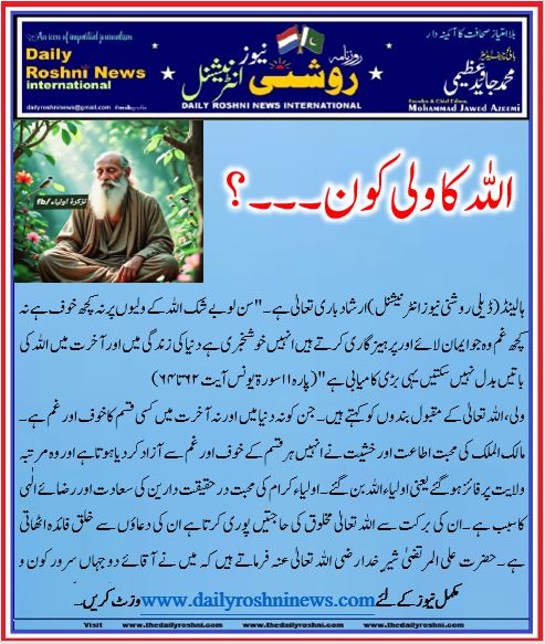 ہالینڈ(ڈیلی روشنی نیوز انٹرنیشنل )ارشادباری تعالیٰ ہے ۔ “سن لو بے شک اللہ کے ولیوں پر نہ کچھ خوف ہے نہ کچھ غم وہ جو ایمان لائے اور پرہیزگاری کرتے ہیں انہیں خوشخبری ہے دنیا کی زندگی میں اور آخرت میں اللہ کی باتیں بدل نہیں سکتیں یہی بڑی کامیابی ہے”(پارہ ۱۱سورۃ یونس آیت ۶۲تا۶۴)