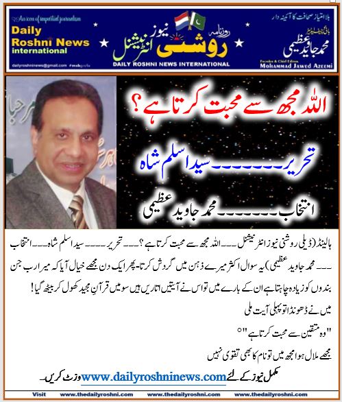 ہالینڈ(ڈیلی روشنی نیوز انٹرنیشنل ۔۔۔ اللہ مجھ سے محبت کرتا ہے ؟۔۔۔ تحریر ۔۔۔۔ سید اسلم شاہ۔۔۔ انتخاب ۔۔۔ محمد جاوید عظیمی)یہ سوال اکثر میرے ذہن میں گردش کرتا ـ پھر ایک دن مجھے خیال آیا کہ میرا رب جن بندوں کو زیادہ چاہتا ہے ان کے بارے میں تو اس نے آیتیں اتاریں ہیں سو میں قرآنِ مجید کھول کر بیٹھ گیا !
