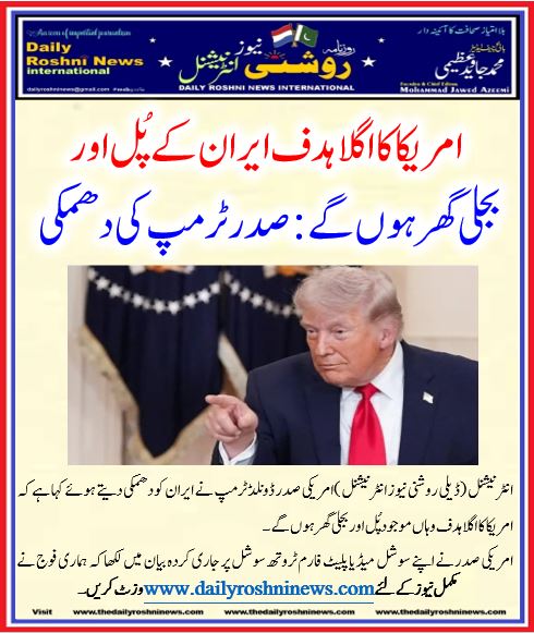 انٹرنیشنل (ڈیلی روشنی نیوز انٹرنیشنل )امریکی صدر ڈونلڈ ٹرمپ نے ایران کو دھمکی دیتے ہوئے کہا ہے کہ امریکا کا اگلا ہدف وہاں موجود پُل اور بجلی گھر ہوں گے۔
