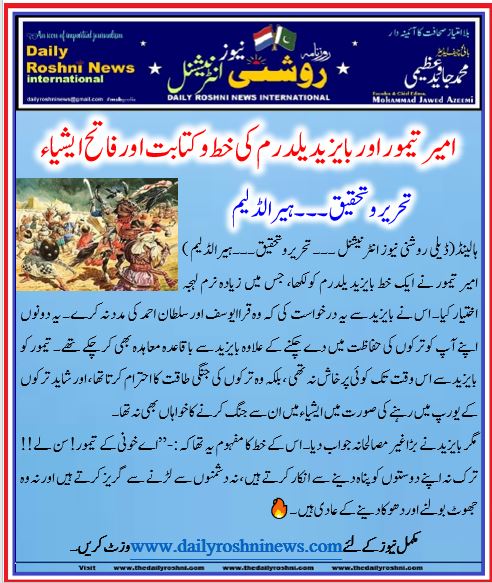 ہالینڈ(ڈیلی روشنی نیوز انٹرنیشنل ۔۔۔ تحریروتحقیق۔۔۔ہیرالڈلیم )امیر تیمور نے ایک خط بایزید یلدرم کولکھا، جس میں زیادہ نرم لہجہ اختیار کیا۔ اس نے بایزید سے یہ درخواست کی کہ وہ قراایوسف اور سلطان احمد کی مدد نہ کرے۔ یہ دونوں اپنے آپ کوترکوں کی حفاظت میں دے چکنے کے علاوہ بایزید سے باقاعدہ معاہدہ بھی کر چکے تھے۔ تیمور کو بایزید سے اس وقت تک کوئی پرخاش نہ تھی ، بلکہ وہ ترکوں کی جنگی طاقت کا احترام کرتا تھا ، اور شاید ترکوں کے یورپ میں رہنے کی صورت میں ایشیاء میں ان سے جنگ کرنے کا خواہاں بھی نہ تھا۔