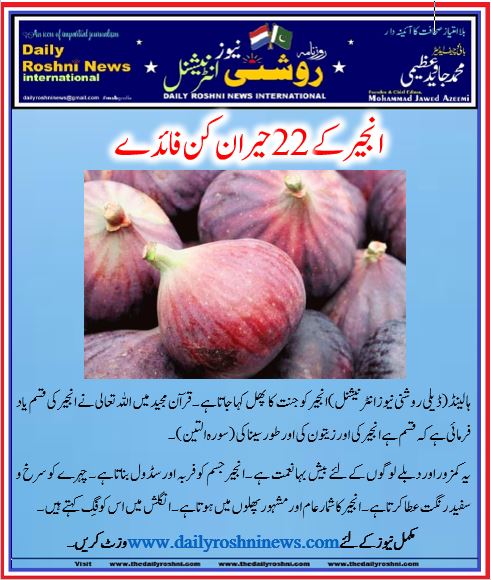 ہالینڈ(ڈیلی روشنی نیوز انٹرنیشنل)انجیر کو جنت کا پھل کہا جاتا ہے ۔ قرآن مجید میں اللہ تعالی نے انجیر کی قسم یا د فرمائی ہے کہ قسم ہے انجیر کی اور زیتون کی اور طورسینا کی ( سورہ التین) ۔