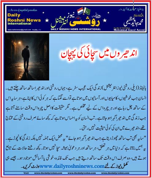 ہالینڈ(ڈیلی روشنی نیوز انٹرنیشنل)زندگی ایک عجیب سفر ہے، جہاں روشنی اور اندھیرا ساتھ ساتھ چلتے ہیں۔ انسان جب خوشیوں، کامیابیوں اور آسانیوں میں ہوتا ہے تو اسے لگتا ہے کہ ہر کوئی اس کا اپنا ہے، ہر سایہ اس کے ساتھ چل رہا ہے اور ہر چہرہ اس کے لیے مخلص ہے۔ مگر حقیقت کا اصل چہرہ اس وقت سامنے آتا ہے جب زندگی میں اندھیرا گہرا ہو جاتا ہے۔ تب انسان کو یہ احساس ہوتا ہے کہ کچھ سائے صرف روشنی کے محتاج تھے، اندھیرے میں ان کی کوئی حیثیت نہیں رہتی۔