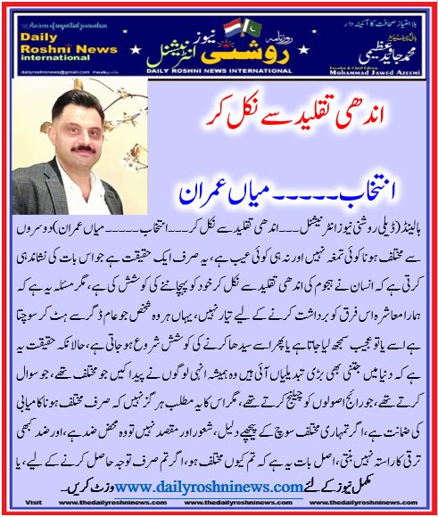 ہالینڈ(ڈیلی روشنی نیوز انٹرنیشنل ۔۔۔ اندھی تقلید سے نکل کر ۔۔۔ انتخاب ۔۔۔۔۔ میاں عمران)دوسروں سے مختلف ہونا کوئی تمغہ نہیں اور نہ ہی کوئی عیب ہے، یہ صرف ایک حقیقت ہے جو اس بات کی نشاندہی کرتی ہے کہ انسان نے ہجوم کی اندھی تقلید سے نکل کر خود کو پہچاننے کی کوشش کی ہے، مگر مسئلہ یہ ہے کہ ہمارا معاشرہ اس فرق کو برداشت کرنے کے لیے تیار نہیں، یہاں ہر وہ شخص جو عام ڈگر سے ہٹ کر سوچتا ہے اسے یا تو عجیب سمجھ لیا جاتا ہے یا پھر اسے سیدھا کرنے کی کوشش شروع ہوجاتی ہے، حالانکہ حقیقت یہ ہے کہ دنیا میں جتنی بھی بڑی تبدیلیاں آئی ہیں وہ ہمیشہ انہی لوگوں نے پیدا کیں جو مختلف تھے، جو سوال کرتے تھے، جو رائج اصولوں کو چیلنج کرتے تھے، مگر اس کا یہ مطلب ہرگز نہیں کہ صرف مختلف ہونا کامیابی کی ضمانت ہے، اگر تمہاری مختلف سوچ کے پیچھے دلیل، شعور اور مقصد نہیں تو وہ محض ضد ہے، اور ضد کبھی ترقی کا راستہ نہیں بنتی، اصل بات یہ ہے کہ تم کیوں مختلف ہو، اگر تم صرف توجہ حاصل کرنے کے لیے، یا خود کو خاص ثابت کرنے کے لیے دوسروں سے الگ بن رہے ہو تو یہ ایک کمزور بنیاد ہے جو زیادہ دیر نہیں چلتی، لیکن اگر تمہاری انفرادیت تمہاری سوچ، تمہارے اصول اور تمہاری محنت کا نتیجہ ہے تو پھر یہی تمہاری اصل طاقت ہے، مسئلہ یہ بھی ہے کہ بہت سے لوگ “خود ہونا” کا مطلب یہ سمجھ لیتے ہیں کہ انہیں کسی اصول، کسی نظم یا کسی تنقید کی ضرورت نہیں، حالانکہ یہ سوچ خود فریبی ہے، اپنی اصل فطرت پر قائم رہنا اس وقت معنی رکھتا ہے جب تم خود کو بہتر بنانے کے عمل سے گزر رہے ہو، اپنی کمزوریوں کو پہچان رہے ہو اور ان پر کام کر رہے ہو، ورنہ صرف یہ کہنا کہ “میں ایسا ہی ہوں” دراصل سستی اور جمود کا بہانہ بن جاتا ہے، یاد رکھو دنیا تمہیں تمہاری نیت سے نہیں بلکہ تمہارے نتائج سے جانچے گی، اس لیے مختلف ہونے کا دعویٰ کرنے سے پہلے یہ دیکھو کہ تم کیا ویلیو پیدا کر رہے ہو، تمہاری سوچ دوسروں کے لیے کیا فائدہ رکھتی ہے، اور تم اپنی زندگی میں کیا ٹھوس تبدیلی لا رہے ہو، کیونکہ خالی دعوے اور منفرد نظر آنے کی خواہش وقتی ہوتی ہے، اصل فرق وہ ہوتا ہے جو عمل سے ثابت ہو، اس کے ساتھ ایک اور حقیقت بھی سمجھ لو کہ مختلف ہونے کی قیمت بھی ادا کرنی پڑتی ہے، تمہیں تنقید سہنی ہوگی، تمہیں تنہائی کا سامنا کرنا پڑے گا، اور کئی بار تمہیں غلط بھی سمجھا جائے گا، اگر تم یہ سب برداشت نہیں کرسکتے تو پھر تم واقعی مختلف ہونے کے لیے تیار نہیں ہو، کیونکہ یہ راستہ آسان نہیں ہے، آخر میں بات سیدھی ہے کہ مختلف ہونا نہ کوئی کمال ہے اور نہ کوئی مسئلہ، اصل چیز یہ ہے کہ تم اس فرق کو کس طرح استعمال کرتے ہو، اگر تم اسے اپنی ترقی، سیکھنے اور کچھ بہتر بنانے کے لیے استعمال کرتے ہو تو یہی تمہاری سب سے بڑی طاقت