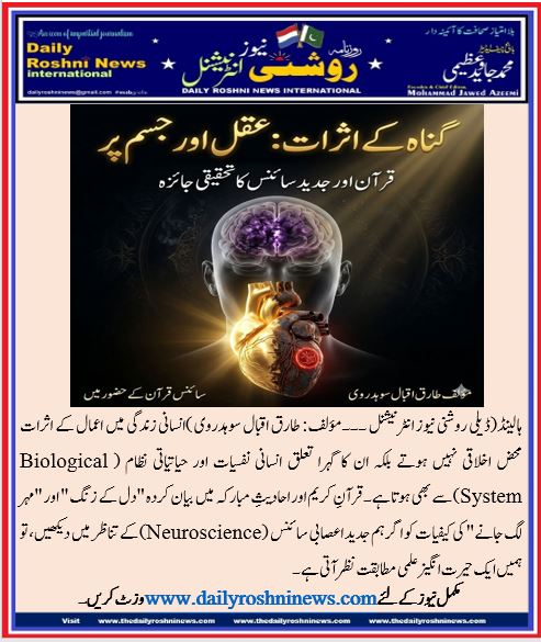 ہالینڈ(ڈیلی روشنی نیوز انٹرنیشنل ۔۔۔مؤلف: طارق اقبال سوہدروی )انسانی زندگی میں اعمال کے اثرات محض اخلاقی نہیں ہوتے بلکہ ان کا گہرا تعلق انسانی نفسیات اور حیاتیاتی نظام (Biological System) سے بھی ہوتا ہے۔ قرآنِ کریم اور احادیثِ مبارکہ میں بیان کردہ “دل کے زنگ” اور “مہر لگ جانے” کی کیفیات کو اگر ہم جدید اعصابی سائنس (Neuroscience) کے تناظر میں دیکھیں، تو ہمیں ایک حیرت انگیز علمی مطابقت نظر آتی ہے۔