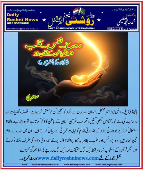 قرآن ہمیں بتاتا ہے کہ انسان صرف گوشت اور ہڈیوں کا مجموعہ نہیں بلکہ ایک پیچیدہ روحانی نظام ہے۔ اس نظام میں روح زندگی کا سرچشمہ ہے، نفس انسان کی خواہشات اور شخصیت کا مرکز ہے اور قلب ہدایت و شعور کا مقام ہے۔ جب تک انسان ان تینوں حقیقتوں کو نہیں سمجھتا وہ خود کو بھی پوری طرح نہیں سمجھ سکتا۔