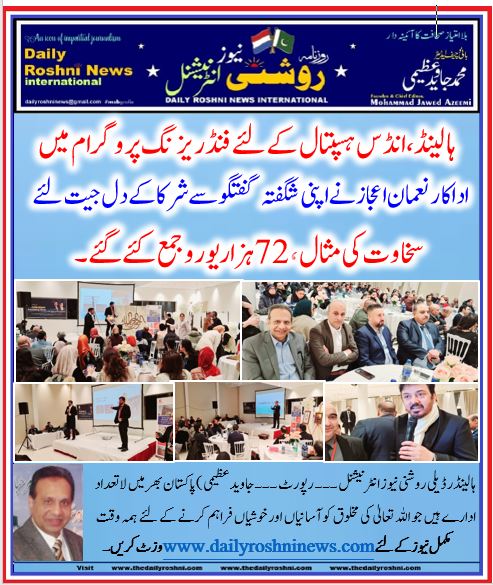 ہالینڈر ڈیلی روشنی نیوز انٹرنیشنل ۔۔۔ رپورٹ ۔۔۔جاوید عظیمی )پاکستان بھر میں لاتعداد ادارے ہیں جو اللہ تعالیٰ کی مخلوق کو آسانیاں اور خوشیاں فراہم کرنے کے لئے ہمہ وقت مصروف عمل ہیں ۔انڈس ہسپتال اینڈ ہیلتھ نیٹ ورک بھی مستحق مریضوں کا مفت علاج کرنے میں نمایاں کردار ادا کر رہا ہے ۔ گزشتہ دنوں بروز اتوار آٹھ فروری 2026 کو ہالینڈ کے شہر ایمسٹرڈیم میں مذکورہ نیٹ ورک کے زیر اہتمام فنڈ ریزنگ کی تقریب منعقد کی گئی۔ تقریب آغاز تلاوت قرآن سے حافظ احمد نے کیا۔ پروگرام کے آرگنائزر ڈاکٹر کامران نے نظامت کے فرائض سرانجام دیتے ہوئے چیرٹی پروگرام کے اغراض و مقاصد اور مرکزی نقطے پرتفصیلی روشنی ڈالی ۔ بعد ازاں پرویز احمد نے دستاویزی فلم کے ذریعے انڈس ہسپتال کی کارکردگی کی تفصیلات بیان ہیں، جبکہ سی ای او ڈاکٹر ظفر زیدی نے ادارے کے سلسلے میں اپنے مخصوص انداز میں مزید آگاہی فراہم کی۔ پاکستانی ٹی وی ڈراموں کے نامور اداکار نعمان اعجاز نے اپنی شگفتہ گفتگو سے فنڈ ریزنگ کا آغاز کیا تو شرکائے تقریب نے دل کھول کر مالی عطیات پیش کئے۔ پروگرام کے دوران کرن نے اسٹیج پر آکر خطاطی کی بعد ازاں اس کو سولہ سو یورو میں نیلام کر دیا گیا ۔ مختصر سے وقت میں ہال میں موجود خواتین و حضرات اور نوجوانوں نے اجتماعی طور پر مذکورہ فنڈ ریزنگ میں 72 ہزار یورو پیش کئے۔