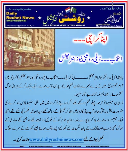 ہالینڈ(ڈیلی روشنی نیوز انٹرنیشنل ۔۔۔۔۔۔ اپنا کراچی ۔۔۔ انتخاب ۔ ڈیلی روشنی نیوز انٹرنیشنل)کراچی میں ٹرام ختم ہوئ ۔ملیر کے ہرے بھرے باغات ختم ہوئے ۔پارسی غائب ہوے ۔ایک ایک کرکے ایرانی ہوٹل ختم ہوئے ۔نشاط بمینو رٹز اور بے شمار سنیما ۔