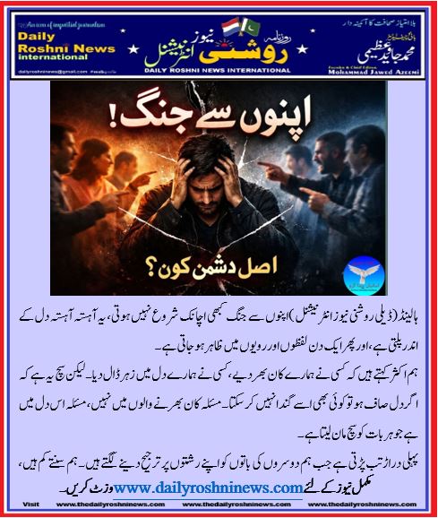 ہالینڈ(ڈیلی روشنی نیوز انٹرنیشنل )اپنوں سے جنگ کبھی اچانک شروع نہیں ہوتی، یہ آہستہ آہستہ دل کے اندر پلتی ہے، اور پھر ایک دن لفظوں اور رویوں میں ظاہر ہو جاتی ہے۔