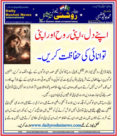 ہالینڈ(ڈیلی روشنی نیوز انٹرنیشنل )اپنی روح کا کوئی بھی حصہ ان لوگوں کے لیے وقف نہ کریں جنہیں لوگوں پر اپنے افعال کے اثر یا اپنی باتوں کی چوٹ کی کوئی پروا نہیں ہوتی، اور نہ ہی ان کے لیے جو آپ کا درد تب تک محسوس نہیں کرتے جب تک وہ ان کے اپنے مقاصد یا خواہشات پر اثر انداز نہ ہو انہیں اپنی توانائی کا حصہ بننے کی اجازت نہ دیں اور نہ ہی اپنی خوشیوں کی بنیاد ان پر رکھیں۔
