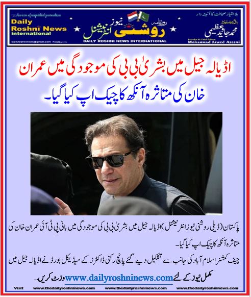 پاکستان(ڈیلی روشنی نیوز انٹرنیشنل )اڈیالہ  جیل میں  بشریٰ بی بی کی موجودگی میں بانی پی ٹی آئی عمران خان کی متاثرہ آنکھ کا چیک اپ کیا گیا۔