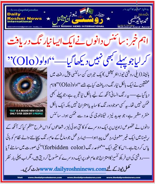 ہالینڈ(ڈیلی روشنی نیوز انٹرنیشنل )ایک حیران کن سائنسی پیش رفت میں محققین نے ایک بالکل نیا رنگ دریافت کیا ہے جسے “او لو (Olo)” کا نام دیا گیا ہے — یہ رنگ انسانی آنکھ کے لیے بالکل نیا تجربہ ہے، جو پہلے کبھی ممکن نہیں تھا۔