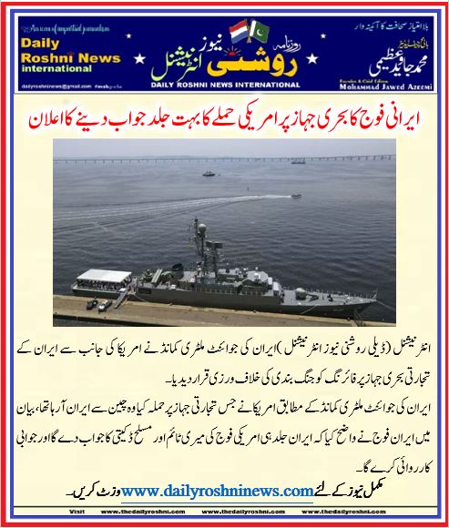 انٹرنیشنل (ڈیلی روشنی نیوز انٹرنیشنل )ایران کی جوائنٹ ملٹری کمانڈ نے امر یکا کی جانب سے ایران کے تجارتی بحری جہاز پر فائرنگ کو جنگ بندی کی خلاف ورزی قرار دیدیا۔
