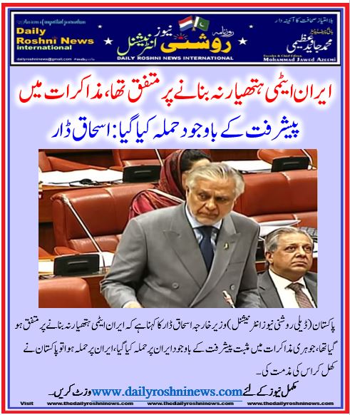 پاکستان(ڈیلی روشنی نیوز انٹرنیشنل )وزیر خارجہ اسحاق ڈار کا کہنا ہے کہ ایران ایٹمی ہتھیار نہ بنانے پر متفق ہو گیا تھا، جوہری مذاکرات میں مثبت پیشرفت کے باوجود ایران پر حملہ کیا گیا، ایران پر حملہ ہوا تو پاکستان نے کھل کر اس کی مذمت کی۔