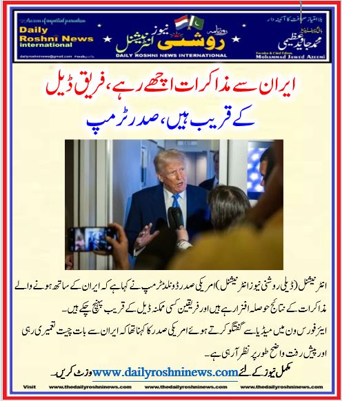 انٹرنیشنل (ڈیلی روشنی نیوز انٹرنیشنل )امریکی صدر ڈونلڈ ٹرمپ نے کہا ہے کہ ایران کے ساتھ ہونے والے مذاکرات کے نتائج حوصلہ افزا رہے ہیں اور فریقین کسی ممکنہ ڈیل کے قریب پہنچ چکے ہیں۔