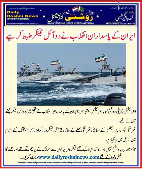 انٹرنیشنل (ڈیلی روشنی نیوز انٹرنیشنل )تہران: ایران کے پاسدارانِ انقلاب نے خلیج  میں دو آئل ٹینکر قبضے میں لے لیے۔
