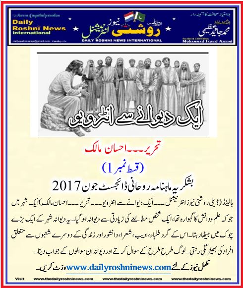 ہالینڈ(ڈیلی روشنی نیوز انٹرنیشنل ۔۔۔ ایک دیوانے سے انٹرویو۔۔۔ تحریر۔۔۔احسان مالک)ایک شہر میں جو کہ علم ودانش کا گہوارہ تھا، ایک شخص مطالعے کی زیادتی سے دیوانہ ہو گیا۔ یہ دیوانہ شہر کے ایک بڑے چوک میں بیٹھارہتا۔ اس کے گرد طلباء، ادیب، شعرا، دانشور اور زندگی کے دوسرے شعبوں سے متعلق افراد کی بھیڑ لگی رہتی۔ لوگ طرح طرح کے سوال کرتے اور دیوانہ ان سوالوں کے جواب دیتا۔