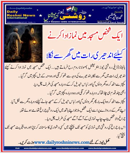 ہالینڈ(ڈیلی روشنی نیوز انٹرنیشنل )مولانا روم رح فرماتے ہیں .. ایک شخص مسجد میں نماز ادا کرنے کیلئے اندھیری رات میں گھر سے نکلا ,