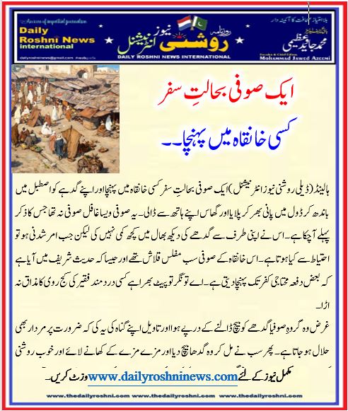 ہالینڈ(ڈیلی روشنی نیوز انٹرنیشنل )ایک صوفی بحالتِ سفر کسی خانقاہ میں پہنچا اور اپنے گدہے کو اصطبل میں باندھ کر ڈول میں پانی بھر کر پلایا اور گھاس اپنے ہاتھ سے ڈالی۔ یہ صوفی ویسا غافل صوفی نہ تھا جس کا ذکر پہلے آچکا ہے۔ اس نے اپنی طرف سے گدھے کی دیکھ بھال میں کچھ کمی نہیں کی لیکن جب امرشدنی ہو تو احتیاط سے کیا ہوتا ہے۔ اس خانقاہ کے صوفی سب مفلس قلاش تھے اور جیسا کہ حدیث شریف میں آیا ہے کہ بعض دفعہ محتاجی کفر تک پہنچادیتی ہے۔ اے تونگر تو پیٹ بھرا ہے کسی درد مند فقیر کی کج روی کا مذا ق نہ اڑا۔
