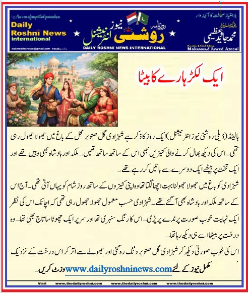 ہالینڈ(ڈیلی روشنی نیوز انٹرنیشنل )ایک روز کا ذکر ہے شہزادی گل صنوبر محل کے باغ میں جھولاجھول رہی تھی۔ اس کی دیکھ بھال کرنے والی کنیزیں بھی اس کے ساتھ ساتھ تھیں۔ ملکہ اوربادشاہ بھی وہیں تھے اور ایک تخت پربیٹھے ایک دوسرے سے باتیں کر رہے تھے۔