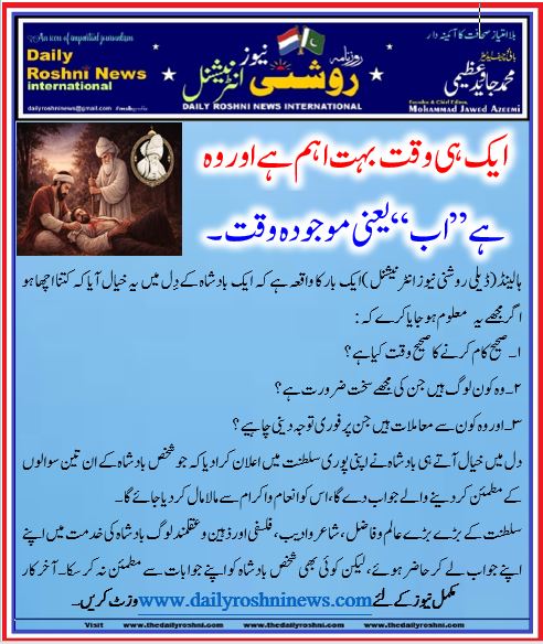 ہالینڈ(ڈیلی روشنی نیوز انٹرنیشنل )ایک بار کا واقعہ ہے کہ ایک بادشاہ کےدِل میں یہ خیال آیا کہ کتنا اچھا ہو اگر مجھے یہ معلوم ہو جایا کرے کہ :