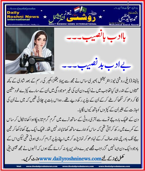 ہالینڈ(ڈیلی روشنی نیوز انٹرنیشنل )میری ساس نے مجھ سے پہلا جھگڑا کھیر کی رسم کے بعد شادی کے کچھ مہینوں کے اندر ہی کیا تھا جب میں نے ایک دن اُن کی غیر موجودگی میں اُن کے سارے کپڑے خود مشین لگا کر دھو کر سُکھا کر طے کرکے اُن کے بیڈ پر رکھ دیے تھے۔ وہ اس بات پر چلائی تھیں کہ میں نے اُن کی اجازت کے بغیر اُن کے کپڑوں کو ہاتھ کیوں لگایا۔