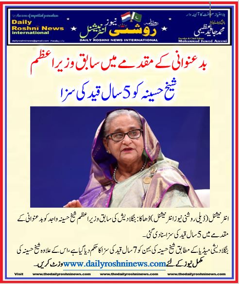انٹرنیشنل (ڈیلی روشنی نیوز انٹرنیشنل )ڈھاکا: بنگلادیش کی سابق وزیراعظم شیخ حسینہ واجد کو بدعنوانی کے مقدمے میں 5 سال قید کی سزا سنادی گئی۔