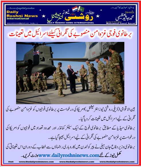 بین الاقوامی (ڈیلی روشنی نیوز انٹرنیشنل )امریکا کی درخواست پر برطانوی فوجیوں کو  غزہ امن منصوبے کی نگرانی کےلیے اسرائیل میں تعینات کردیا گیا۔