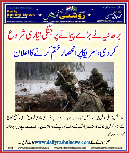 انٹرنیشنل(ڈیلی روشنی نیوز انٹرنیشنل )برطانیہ نے بڑے پیمانے پر جنگ کی تیاری شروع کردی، مسلح افواج کے وزیر کرنل ایسکاٹ کارنز نے کہا جنگ کے سائے یورپ کے دروازے پر دستک دے رہے ہیں ، برطانیہ کو تیار ہونا ہوگا۔