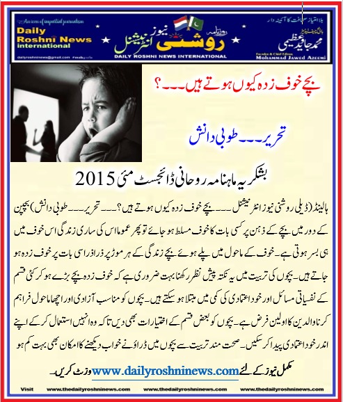 ہالینڈ(ڈیلی روشنی نیوز انٹرنیشنل ۔۔۔ بچے خوف زدہ کیوں ہوتے ہیں؟۔۔۔ تحریر۔۔۔طوبی دانش)بچپن کے دور میں بچے کے ذہن پر کسی بات کا خوف مسلط ہو جائے تو پھر عموما اس کی ساری زندگی اس خوف میں ہی بسر ہوتی ہے۔ خوف کے ماحول میں پلے ہوئے بچے زندگی کے ہر موڑ پر ذراذرا سی بات پر خوف زدہ ہو جاتے ہیں۔ بچوں کی تربیت میں یہ نکتہ پیش نظر رکھنا بہت ضروری ہے کہ خوف زدہ بچے بڑے ہو کر کئی قسم کے نفسیاتی مسائل اور خود اعتمادی کی کمی میں مبتلا ہو سکتے ہیں۔ بچوں کو مناسب آزادی اور اچھا ماحول فراہم کرنا والدین کا اولین فرض ہے۔ بچوں کو بعض قسم کے اختیارات بھی دیں تا کہ وہ انہیں استعمال کر کے اپنے اندر خود اعتمادی پیدا کر سکیں۔ صحت مند تربیت سے بچوں میں ڈراؤنے خواب دیکھنے کا امکان بھی بہت کم ہو جاتا ہے اور بچے بستر میں پیشاب بھی نہیں کرتے۔ بعض بچے فطرتا بہت زیادہ حساس یا ڈرپوک ہوتے ہیں۔ ذراسی بات یا غلطی پر ان کے ذہن خوف سے بوجھل ہو جاتے ہیں اور طرح طرح کے وہم اور خدشے ان کے دل میں پیدا ہونے لگتے ہیں۔ بچوں سے اکثر اوقات پیسے کھو جاتے ہیں یا کوئی چیز ٹوٹ جاتی ہے تو ماں باپ بہت زیادہ مار پیٹ کرتے ہیں۔