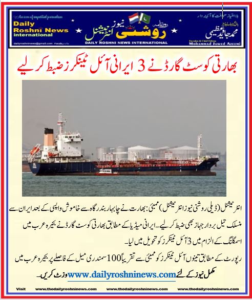 انٹرنیشنل (ڈیلی روشنی نیوز انٹرنیشنل )ممبئی: بھارت نے چابہار بندرگاہ سے خاموش واپسی کے بعد ایران سے منسلک تیل بردار جہاز بھی ضبط کر لیے۔ایرانی میڈیا کے مطابق بھارتی کوسٹ گارڈ نے بحیرہ عرب میں اسمگلنگ کے الزام میں 3 آئل ٹینکرز کو تحویل میں لیا۔