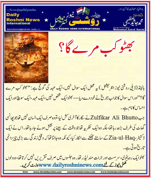ہالینڈ(ڈیلی روشنی نیوز انٹرنیشنل ) یہ محض ایک سوال نہیں، ایک عہد کی گونج ہے: “بھٹو کب مرے گا؟”اور اس سوال کا جواب تاریخ نے خود دے دیا — بھٹو ایک شخص نہیں، ایک عہد، ایک سوچ اور ایک احساس کا نام ہے۔