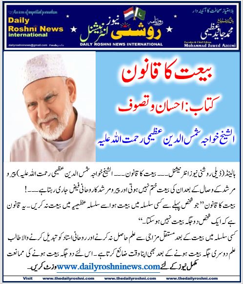 ہالینڈ(ڈیلی روشنی نیوز انٹرنیشنل ۔۔۔ بیعت کا قانون ۔۔۔ الشیخ خواجہ شمس الدین عظیمی رحمت اللہ علیہ)پیر و مرشد کے وصال کے بعد ان کی بیعت ختم نہیں ہوتی اور پیر و مرشد کا روحانی فیض جاری رہتا ہے ۔۔۔!