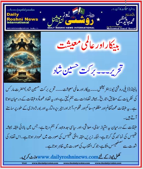 ہالینڈ(ڈیلی روشنی نیوز انٹرنیشنل ۔۔۔ بینکار اور عالمی معیشت ۔۔۔ تحریر برکت حسین شاد )حضرت مارکس کی نظریات کے مطابق، تاریخ۔ ہمیشہ تضادات سے جنم لیتی ہے، اور یہ تضاد عموماً دو طبقات کے درمیان ہوتا ہے۔ یہ طبقات عموماً ظالم اور مظلوم، حاکم اور محکوم، آجر اور اجیر، پرولتاریہ اور بورژوازی کے طور پر سامنے آتے ہیں۔