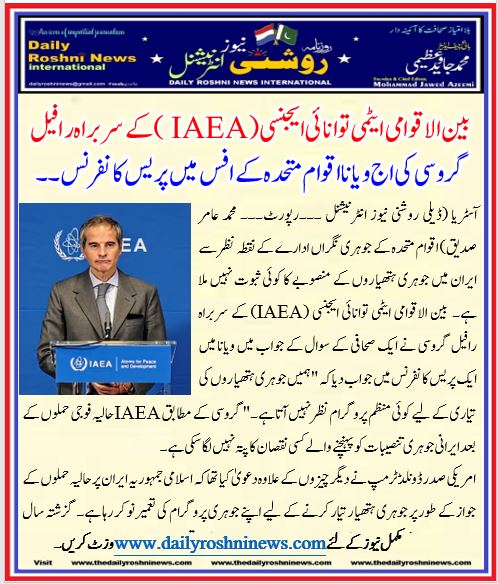 آسٹریا (ڈیلی روشنی نیوز انٹرنیشنل ۔۔۔رپورٹ۔۔۔ محمد عامر صدیق) اقوام متحدہ کے جوہری نگراں ادارے کے نقطہ نظر سے ایران میں جوہری ہتھیاروں کے منصوبے کا کوئی ثبوت نہیں ملا ہے۔  بین الاقوامی ایٹمی توانائی ایجنسی (IAEA) کے سربراہ رافیل گروسی نے ایک صحافی کے سوال کے جواب میں ویانا میں ایک پریس کانفرنس میں جواب دیا کہ “ہمیں جوہری ہتھیاروں کی تیاری کے لیے کوئی منظم پروگرام نظر نہیں آتا ہے۔”