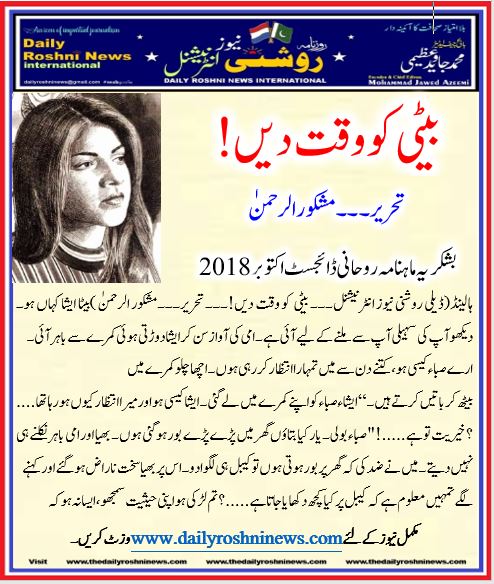 ہالینڈ(ڈیلی روشنی نیوز انٹرنیشنل۔۔۔ بیٹی  کو وقت دیں!۔۔۔ تحریر۔۔۔مشکور الرحمنٰ )بیٹا ایشا کہاں ہو۔ دیکھو آپ کی سہیلی آپ سے ملنے کے لیے آئی ہے۔ امی کی آواز سن کر ایشا دوڑتی ہوئی کمرے سے باہر آئی۔