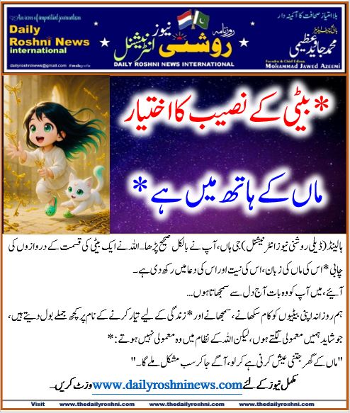 ہالینڈ(ڈیلی روشنی نیوز انٹرنیشنل )جی ہاں، آپ نے بالکل صحیح پڑھا۔اللہ نے ایک بیٹی کی قسمت کے دروازوں کی چابی *اس کی ماں کی زبان، اس کی نیت اور اس کی دعا میں رکھ دی ہے۔