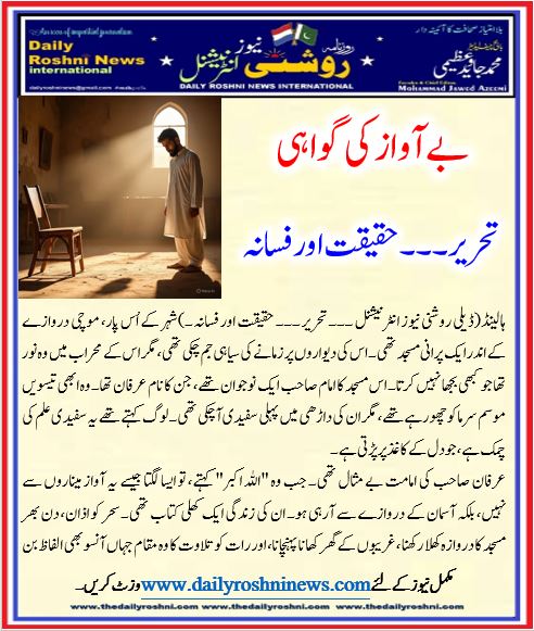 ہالینڈ(ڈیلی روشنی نیوز انٹرنیشنل ۔۔۔ تحریر ۔۔۔ حقیقت اور فسانہ ۔)شہر کے اُس پار، موچی دروازے کے اندر ایک پرانی مسجد تھی۔ اس کی دیواروں پر زمانے کی سیاہی جم چکی تھی، مگر اس کے محراب میں وہ نور تھا جو کبھی بجھا نہیں کرتا۔ اس مسجد کا امام صاحب ایک نوجوان تھے، جن کا نام عرفان تھا۔ وہ ابھی تیسویں موسم سرما کو چھو رہے تھے، مگر ان کی داڑھی میں پہلی سفیدی آ چکی تھی۔ لوگ کہتے تھے یہ سفیدی علم کی چمک ہے، جو دل کے کاغذ پر پڑتی ہے۔