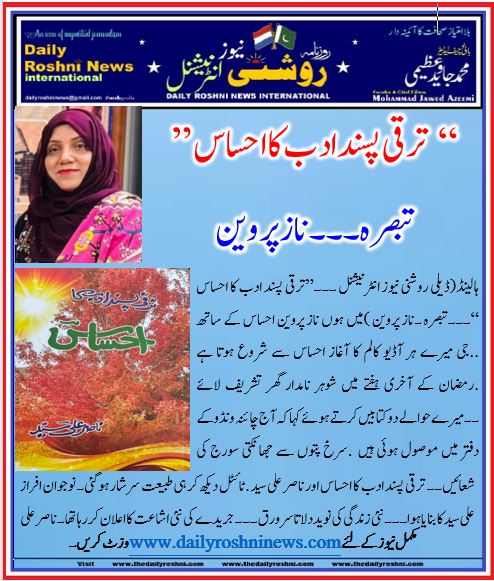 ہالینڈ(ڈیلی روشنی نیوز انٹرنیشنل ۔۔۔”ترقی پسند ادب کا احساس “۔۔۔تبصرہ ۔ناز پروین )میں ہوں ناز پروین احساس کے ساتھ ..جی میرے ہر آڈیو کالم کا آغاز احساس سے شروع ہوتا ہے .رمضان کے آخری ہفتے میں شوہر نامدار گھر تشریف لائے ۔۔میرے حوالے دو کتابیں کرتے ہوئے کہا کہ آج چائنہ ونڈو کے دفتر میں موصول ہوئی ہیں  .سرخ پتوں سے جھانکتی سورج کی شعائیں۔۔  ترقی پسند ادب کا احساس اور ناصر علی سید .ٹائٹل دیکھ کر ہی طبیعت سرشار ہو گئی۔ نوجوان افراز علی سید کا بنایا ہوا۔۔۔ نئی زندگی کی نوید دلاتا سر ورق ۔۔۔ جریدے کی نئی اشاعت کا اعلان کر رہا تھا  ۔ناصر علی سید اور  بھابھی فی الحال اپنے بچوں کے پاس کینیڈا اور امریکہ میں ہیں اس کے باوجود ان کا دل یہیں پشاور میں اٹکا رہتا ہے۔اتنے خوبصورت جریدے میں میرا نہ صرف مضمون شامل کیا بلکہ اہتمام بھی کیا کہ مجھ تک پہنچ بھی جائے ۔اب ہم اتنی محبتوں کے مقروض ہیں  ۔ احساس (میرے کالم  کا  نام ) اور میرا تعلق گزشتہ آٹھ برس کا ہے .آغاز ہی سے خوش قسمتی رہی کہ ناصر علی سید صاحب کا دست شفقت میسر آیا اور رہنمائی بھی .تھوڑی تحقیق کی تو معلوم ہوا کہ احساس ” (ادبی جریدے )کو یہ اعزاز حاصل رہا ھے کہ اسکی ادارت ممتاز شاعر ،ادیب ،نقاد ،محقق خاطر غزنوی کرتے رہے ہیں اور اس کو اپنے عہد میں بام عروج تک پہنچایا ۔ پھر  دوسرے دور میں خاطر غزنوی کو ناصر علی سید کا ساتھ میسر رہا. خاطر غزنوی کی وفات کے بعد احساس کے تیسرے دور میں ناصر علی سید کو حسام حر کی فعال معاونت ملی مگر اب کچھ عرصے سے جریدہ عارضی طور پر  تعطل کا شکار ھوا ۔ ایک عرصے کے بعد    اب اس معروف جریدے کے مدیر اعلیٰ عالمی شہرہ آفاق ،ممتاز ترقی پسند شاعر، ادیب ،کالم نگار ،ڈرامہ نویس اورصدارتی ایوارڈ یافتہ استاد محترم ناصر علی سید صاحب نے دوبارہ اشاعت کا سلسلہ شروع کیا   ۔۔۔جو کہ بہت خوش آئیند  ھے ۔ ایک ایسا ادبی جریدہ جس کی سرپرستی اتنی نامی گرامی شخصیات کرتی رہی ہیں ۔ اب  اس کا دوبارہ اجرا ادبی دنیا کے لیے ایک خوشخبری ہے  ۔ادبی دنیا کی چمکتی دمکتی کہکشاں میں ایک نو آموز لکھاری کو جگہ دے کر مجھے بہت بڑی سعادت دی ہے ۔مشتاق شباب ، پروفیسر ڈاکٹر خالد مفتی ، ڈاکٹر نور حکیم جیلانی، ڈاکٹر فضل کبیر ،فارغ بخاری، رضا ہمدانی ،خاطر غزنوی ،عتیق احمد صدیقی، ڈاکٹر فصیح الدین، خالد سہیل ملک، پروفیسر سہیل احمد ،ڈاکٹر نظیر تبسم ، یوسف عزیز زاہد ،ناصر علی سید اور  دیگر  نابغائے روزگار ادیبوں کے ساتھ ساتھ اپنا نام لکھا دیکھ کر عجیب سرشاری کی کیفیت ہوئی ۔اللہ اللہ یہ مقام ۔ یہ  اعزاز۔۔۔پورے جریدے میں گنتی کی چند خواتین میں میرا بھی نام اور مضمون شامل تھا۔۔ جس نے ایک بار پھر اعتماد بڑھایا اور مزید اچھا اور بہتر لکھنے کی ترغیب دی ۔شاعری کا انتخاب ہو یا مضامین سب بہترین اور بے حد دلچسپ ۔ان سب کو اکٹھا کرنا ترتیب دینا اور پھر انتہائی خوبصورت طباعت  کے ساتھ پیش کرنا۔۔۔ یقیناً ناصر علی سید ہی ایسا کر سکتے ہیں ۔سفرنامہ ہو ،طنزومزاح ، ذہنی صحت ، شخصی خاکے، مختصر افسانے،تنقید نگاری ، خوبصورت شاعری سب مل کر ایک خوبصورت گلدستے کی مانند احساس کی شکل میں اکٹھے کر دیے گئے ہیں ۔احساس صرف ایک بار پڑھنے سے طبیعت سیر نہیں ہوتی بلکہ بیڈ کے سرہانے سائیڈ ٹیبل پر پڑا بار بار مجبور کرتا ہے کہ اسے دوبارہ ،سہ بارہ پڑھیں ۔۔پاکستان بھر کے ساتھ ساتھ آسٹریا، امریکہ، ساؤتھ افریقہ، انگلینڈ ،انڈیا، قطر سے بھی ادیبوں، شاعروں کی نگارشات شامل کی گئی ہیں ۔جس نے اسے جغرافیائی حدود و قیود سے آزاد کر کے ایک بین الاقوامی ادبی جریدے کی حیثیت دے دی ہے ۔پرکشش ٹائٹل ۔274 صفحات ۔بہترین طباعت اور قیمت محض 400 روپے ۔جبکہ اس معیار کی کتابوں کی قیمت کم سے کم  دو ہزار روپے ہوتی  ہے ۔ادب سے بے لوث محبت کرنے والوں نے یقیناً اس کی طباعت میں بھی اپنا حصہ ڈالا ہوگا۔اتنی محنت ناصر صاحب اگر اپنے لیے کرتے تو ان کے بے شمار مسودوں میں سے ایک یقیناً خوبصورت کتاب کی شکل اختیار کر لیتا ۔لیکن ادب سے ان کے بے  لوث لگاؤ کی اس سے بڑی م