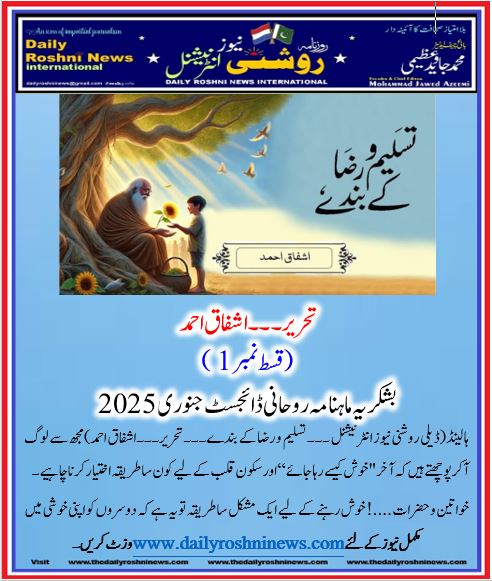 ہالینڈ(ڈیلی روشنی نیوز انٹرنیشنل ۔۔۔ تسلیم و رضا کے بندے۔۔۔ تحریر۔۔۔اشفاق احمد)مجھ سے لوگ آکر پوچھتے ہیں کہ آخر ” خوش کیسے رہا جائے“ اور سکون قلب کے لیے کون سا طریقہ اختیار کرنا چاہیے۔