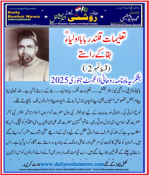 ہالینڈ(ڈیلی روشنی نیوز انٹرنیشنل ۔۔۔ تعلیمات قلندر بابا اولیاء۔۔۔ بقا کے راستے) گیا ہے ۔ اللہ تعالی اپنا پیغام بعض مخصوص ہستیوں یعنی اپنے انبیاء پر نازل فرماتے ۔ انبیاء وہ پیغام انسانوں تک پہنچاتے تھے۔