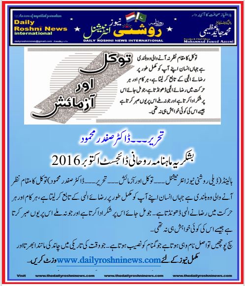 ہالینڈ(ڈیلی روشنی نیوز انٹرنیشنل ۔۔۔ توکل اور آزمائش۔۔۔ تحریر۔۔۔ڈاکٹر صفدر محمود)توکل کا مقام نظر آنے والی وہ بلندی  ہے جہاں انسان اپنے آپ کو مکمل طور  پررضا ئے الہی  کے تابع کر لیتا ہے، ہر کام اور ہر حرکت میں رضا نے الہی ڈھونڈتا ہے۔  جو مل  جائے اس پر شکر ادا کرتا ہے اورجو نہ ملے  اس پر یوں صبر کرتا ہے جیسے اس کی کوئی خواہش ہی نہ تھی۔