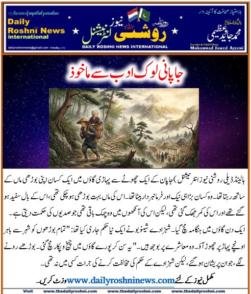 ہالینڈڈیلی روشنی نیوز انٹرنیشنل )جاپان کے ایک چھوٹے سے پہاڑی گاؤں میں ایک کسان اپنی بوڑھی ماں کے ساتھ رہتا تھا۔ وہ کسان بڑا ہی نیک اور فرمانبردار بیٹا تھا۔ اس کی ماں بہت بوڑھی ہو چکی تھی، اس کے بال سفید ہو گئے تھے اور اس کی کمر جھک گئی تھی، لیکن اس کی آنکھوں میں وہ چمک باقی تھی جو صدیوں کی حکمت دیتی ہے۔