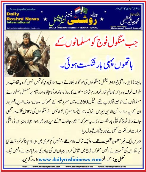 ہالینڈ(ڈیلی روشنی نیوز انٹرنیشنل )منگولوں کی خونخوار یلغار نے جب اسلامی دنیا کو تہس نہس کر دیا تھا، تب ہر طرف خوف و ہراس کا عالم تھا۔ خوارزم شاہی سلطنت کا زوال، بغداد کی تباہی، اور شام پر مسلسل حملوں نے مسلمانوں کے حوصلے توڑ دیے تھے۔ لیکن 1260ء میں مصر و شام کے مملوک سلطان سیف الدین قطز اور ان کے سپہ سالار رکن الدین بیبرس نے ایک تاریخ ساز معرکہ لڑا، جس نے منگولوں کی ناقابلِ شکست سمجھی جانے والی فوج کو پہلی بار شکست دی۔ یہ معرکہ “عین جالوت” کے میدان میں ہوا، جہاں بیبرس کی جنگی مہارت اور حکمت عملی نے تاریخ کا رخ بدل دیا۔