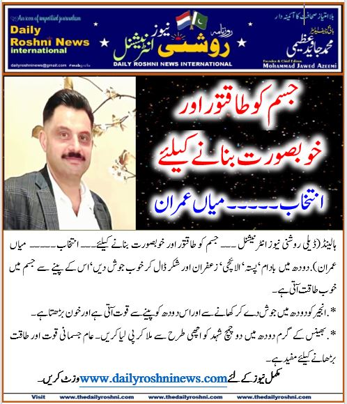ہالینڈ(ڈیلی روشنی نیوز انٹرنیشنل ۔۔۔ جسم کو طاقتور اور خوبصورت بنانے کیلئے۔۔۔ انتخاب ۔۔۔۔۔ میاں عمران).دودھ میں بادام‘ پستہ‘ الائچی‘ زعفران اور شکر ڈال کر خوب جوش دیں‘ اس کے پینے سے جسم میں خوب طاقت آتی ہے۔