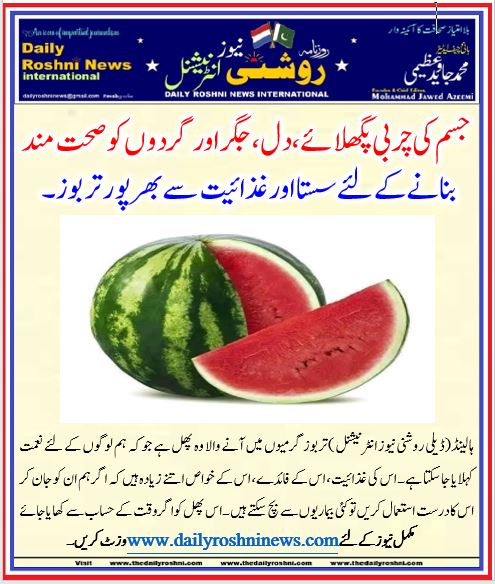 ہالینڈ(ڈیلی روشنی نیوز انٹرنیشنل )تربوز گرمیوں میں آنے والا وہ پھل ہے جو کہ ہم لوگوں کے لئے نعمت کہلایا جا سکتا ہے۔ اس کی غذائیت، اس کے فائدے، اس کے خواص اتنے زیادہ ہیں کہ اگر ہم ان کو جان کر اس کا درست استعمال کریں تو کئی بیماریوں سے بچ سکتے ہیں۔ اس پھل کو اگر وقت کے حساب سے کھایا جائے جیسے کہ کھانے سے پہلے اس کا کھانا درست ہے یا کھانے کے بعد یہ زیادہ فائدہ کرے گا یا صبح کھانا بہتر ہے یا دن میں وغیرہ وغیرہ، تو اس پھل کی افادیت زیادہ بڑھ جاتی ہے۔ اس میں 90 فیصد سے زائد پانی موجود ہے، یہ نہ صرف پیاس کی شدت کو کم کرتا ہے بلکہ جسم کو فرحت بخش احساس بھی فراہم کرتا ہے۔ اس کو ٹھنڈا کر کے کھایا جائے تو گرمی میں جسم وجاں کو ایسی راحت محسوس ہوتی ہے کہ گرمی کا تمام احساس ختم ہوجاتا ہے۔