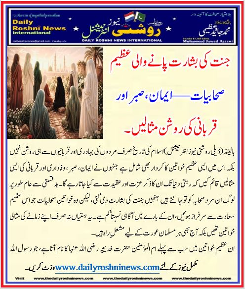 ہالینڈ(ڈیلی روشنی نیوز انٹرنیشنل )اسلام کی تاریخ صرف مردوں کی بہادری اور قربانیوں سے ہی روشن نہیں بلکہ اس میں ایسی عظیم خواتین کا کردار بھی شامل ہے جنہوں نے ایمان، صبر، وفاداری اور قربانی کی ایسی مثالیں قائم کیں کہ رہتی دنیا تک ان کا ذکر عزت اور عقیدت سے کیا جاتا رہے گا۔ بدقسمتی سے عام طور پر لوگ ان مرد صحابہ کو تو جانتے ہیں جنہیں جنت کی بشارت دی گئی، لیکن وہ خواتین صحابیات جو اس عظیم سعادت سے سرفراز ہوئیں، ان کے بارے میں آگاہی نسبتاً کم ہے۔ یہ ہستیاں نہ صرف اپنے زمانے کی مثالی خواتین تھیں بلکہ آج بھی ہر مسلمان عورت کے لیے مشعلِ راہ ہیں۔