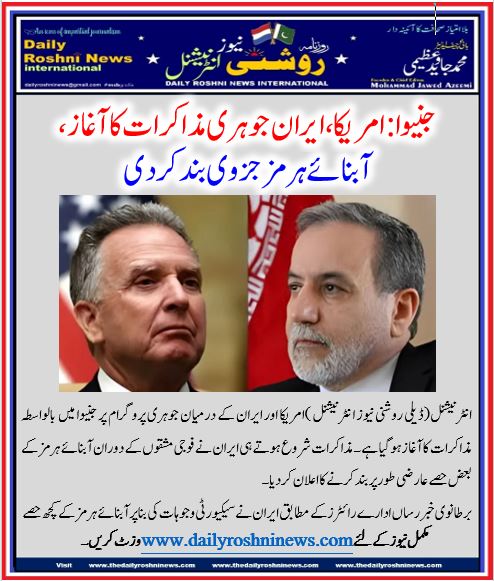 انٹرنیشنل(ڈیلی روشنی نیوز ا نٹرنیشنل )امریکا اور ایران کے درمیان جوہری پروگرام پر جنیوا میں بالواسطہ مذاکرات کا آغاز ہوگیا ہے۔ مذاکرات شروع ہوتے ہی ایران نے فوجی مشقوں کے دوران آبنائے ہرمز کے بعض حصے عارضی طور پر بند کرنے کا اعلان کر دیا۔