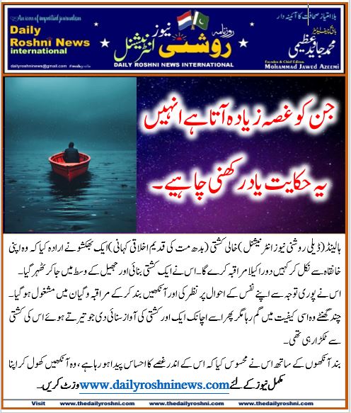 ہالینڈ(ڈیلی روشنی نیوز انٹرنیشنل )خالی کشتی (بدھ مت کی قدیم اخلاقی کہانی )ایک بھکشو نے ارادہ کیا کہ وہ اپنی خانقاہ سے نکل کر کہیں دور اکیلا مراقبہ کرے گا۔ اس نے ایک کشتی بنائی اور جھیل کے وسط میں جا کر ٹھہر گیا۔